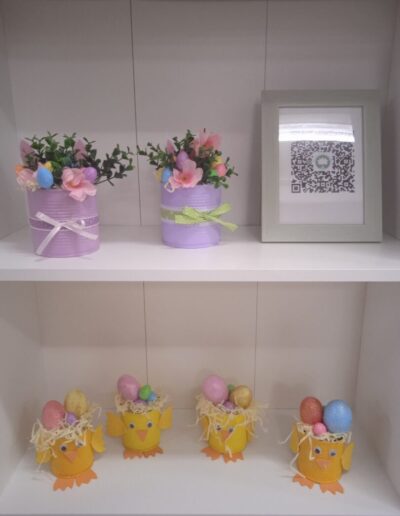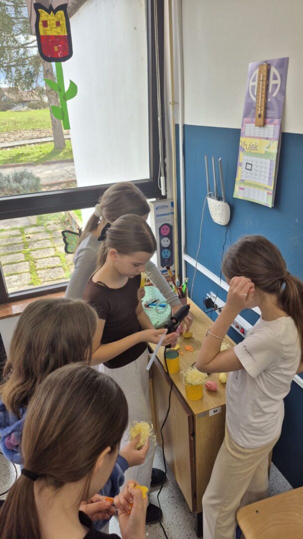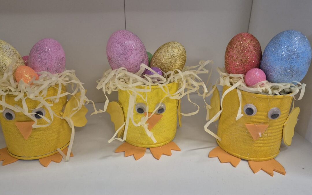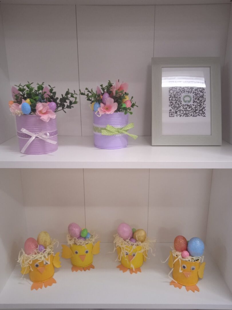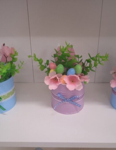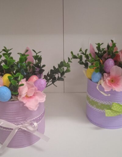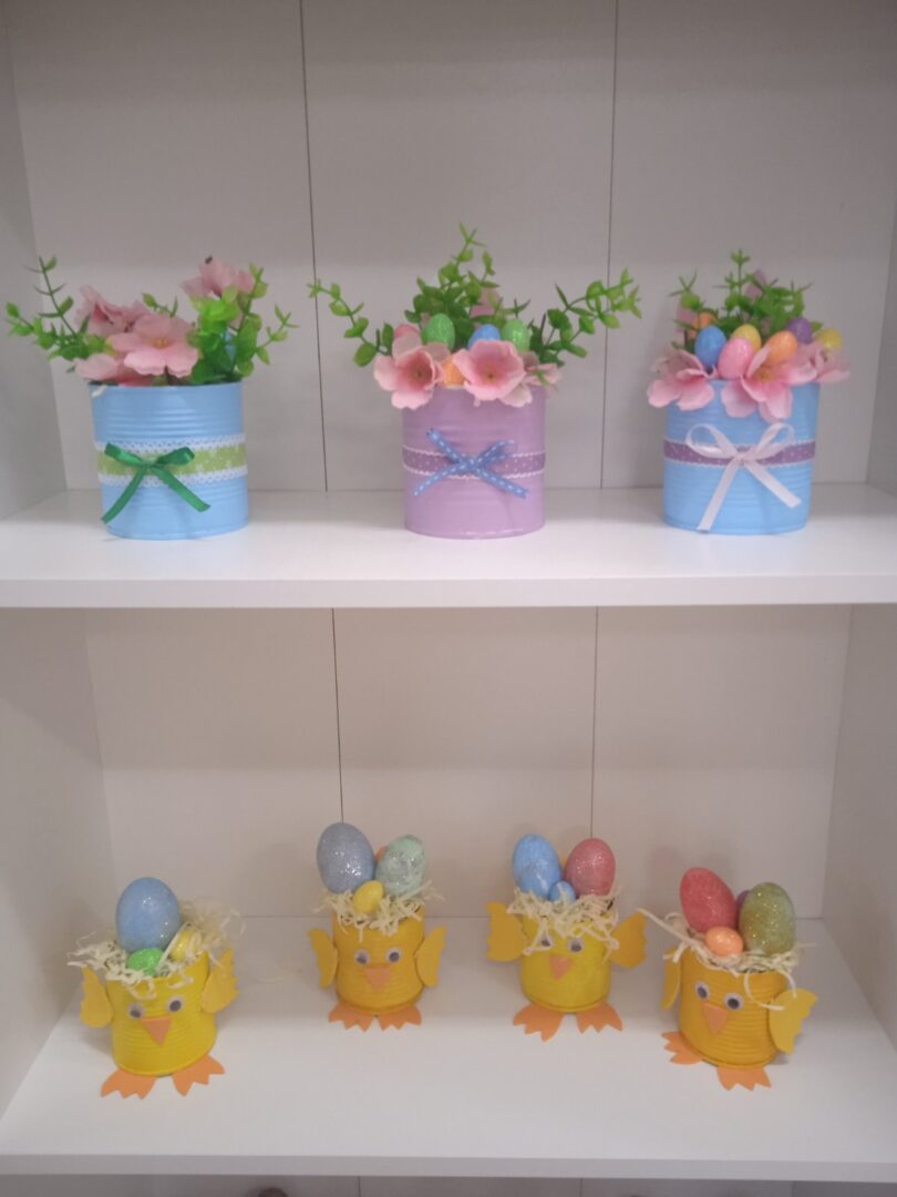 Mali žuti pilići sa pisanicama nastali su od recikliranih konzervi kao i veći aranžmani sa pisanicama i cvijećem. Uz poduzetnički duh, brinemo i o okolišu. Sve što možemo ponovo upotrijebiti važno je iskoristiti i prenamijeniti za neku drugu svrhu. Mi zadrugari to jako dobro znamo!